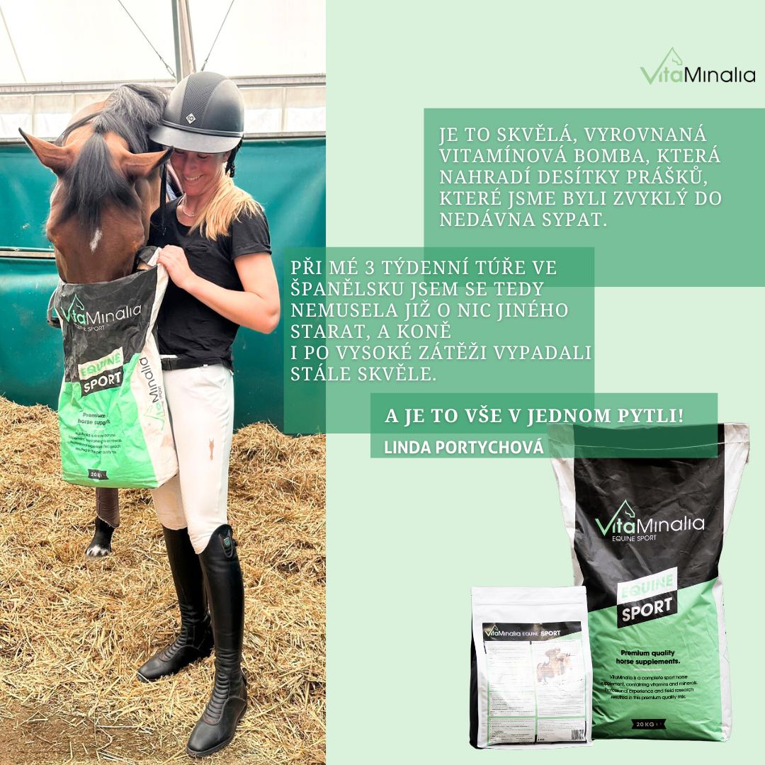 "S Vitaminalia Sport byli naši koně celou závodní sezonu ve skvělé kondici – měli lesklou srst, drželi váhu, rychle regenerovali a zvládali i vícedenní závody bez únavy. Jakmile jsme doplněk vysadili, rozdíl byl okamžitě znát. Doporučujeme všem sportovním koním."
